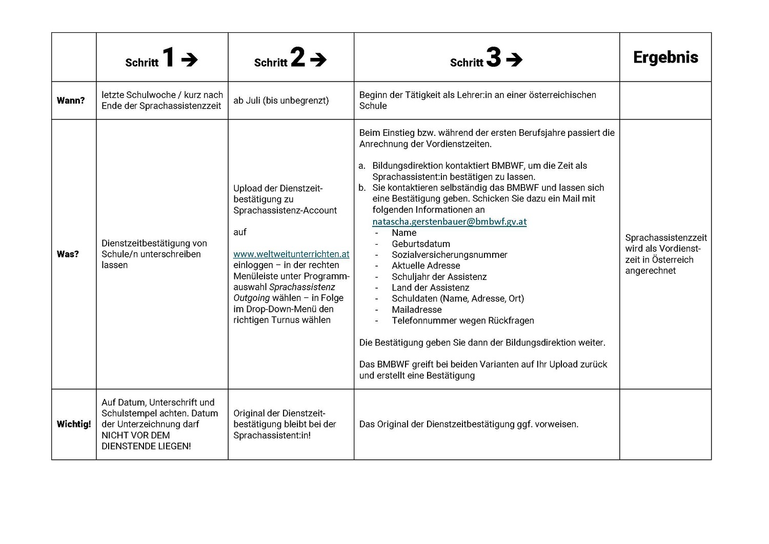 Lassen Sie sich auf jeden Fall am Ende der Sprachassistenz eine Bescheinigung über Ihre gesamte Dienstzeit ausstellen. Diese stellt normalerweise die Stammschule aus. Das dazu notwendige Formular finden Sie hier zum Download.