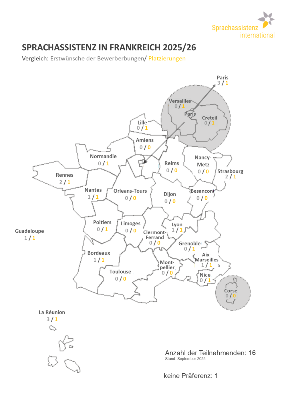 Allgemein weltweit unterrichten ist auf österreichischer Seite vermittelnde Organisation und begleitet Sie von der Bewerbung bis zur Platzierung in den académies. In die direkten Schulzuweisungen sind wir jedoch nicht eingebunden und können keine Auskunft dazu geben. Natürlich stehen wir Ihnen auch während der Sprachassistenzzeit bei Fragen zur Verfügung.